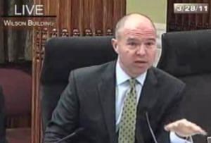 We’ve now passed the hour mark on Ward 3 Councilmember Mary Cheh’s oversight hearing on the hiring policies of Mayor Vince Gray and his administration. But so far, the most notable news is who isn’t testifying at the hearing: Sulaimon Brown, former Gray Chief of Staff Gerri Mason Hall, Gray campaign chair Lorraine Green and campaign consultant and alleged bag man Howard Brooks, who weren’t even on the hearing’s witness list. (UPDATE: Brown told media that he didn’t receive an invitation to come to the hearing until today; Cheh staffer Jay Carmona says that “Mr. Brown did not respond to several calls” inviting him to testify.) During his opening statement, Councilmember David Catania (I-At-Large) said that the witness list “does leave me a little wanting.” Cheh’s office told Alan Suderman that the Councilmember is planning to hold a second hearing on April 7 with more witnesses, but for today it sounds like — barring someone crashing the hearing — we’ll have to settle by being entertained with Catania and Marion Barry’s grandstanding/sniping at one other. To wit: Barry accused Catania of basing his criticisms of the administration on his distaste for Gray and making “loose and wild statements that the government is for sale,” after which Catania responded, “I will respectfully decline having my Ward 8 colleague serve as my moral and ethical compass.”
