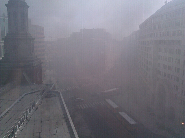 This image, captured by DCist Flickr pool contributor Danny Dougherty, proves just how much smoke was left floating around downtown after a rooftop cooling tower caught on fire at 1401 I Street NW this morning. Eerie.