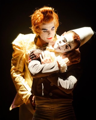 Greg Anderson and Chris Dinolfo in Synetic’s King Lear. Photo: Graeme B. Shaw.Balloons. Tricycles. Clowns. A rave party. A stage covered with coarse sand. And not a spoken word all night. Why, of course — this must be a production of…King Lear?! But banish any worries, because this is a production by those masters of the unlikely reimagining, Synetic Theater.