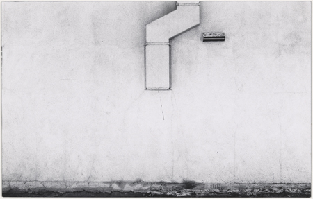 Lewis BaltzLaguna Niguel, 1970gelatin silver printsheet: 13.81 x 21.59 cm (5 7/16 x 8 1/2 in.)Laguna Art Museum Collection, Anonymous gift, in memory of Beula Prince© Lewis Baltz.Baltz sought to “refute photography’s apparently essential character as a means of making images of the three-dimensional world.” He did this by taking the bold liberty of removing one dimension. Many of the subjects in Prototypes are shot straight ahead, eliminating perspective cues and for the most part eschewing shadow. Thus the most mundane of subjects – a plaster wall with descending duct work, a parking lot – become evocative black and white abstractions.