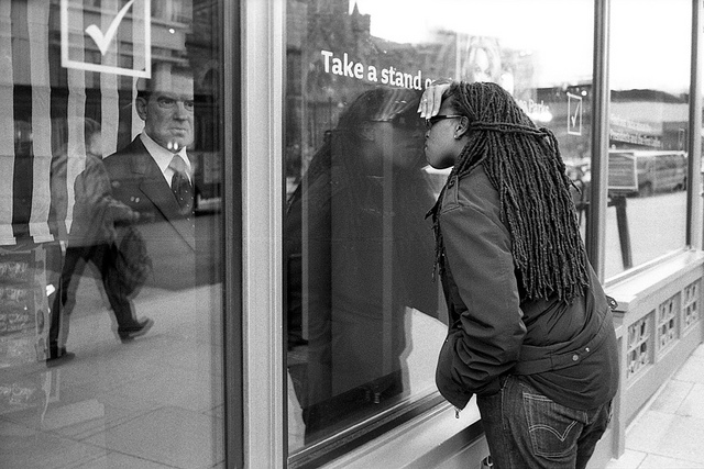 It’s always tricky to get a storefront window shot to work well. But that’s exactly what Aziz . has managed to pull off, balancing the reflection of the person looking in and the passerby in motion with the sinister character peering out from behind the glass.