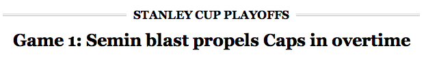 In light of Alexander Semin’s dramatics in last night’s win over New York, here was the prominent headline in today’s Washington Post sports section. (UPDATE: The Post changed the word “blast” to “goal” shortly after this post went up.) Don’t try and act like you didn’t think about the exact same thing we did. To the Post: whatever you do, please just leave the Wang jokes to us, okay?