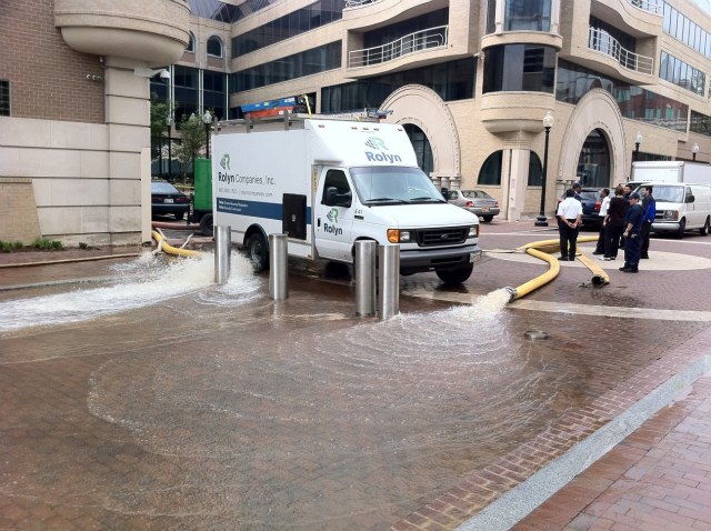 Photo by Jim Webb.- As you can see from the image above, work is still being done to clean out the Washington Harbour in Georgetown. Farmers and Fishers, one of the restaurants affected, said via Twitter that they are “working hard to get water out so we can re-open soon”; Tony and Joe’s looks to have taken it the hardest. Jonathan O’Connell, meanwhile, shares a photo of what the Harbour’s flood gates look like when they’re fully installed (compare that to our photos earlier).