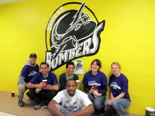 Team DCist is feeling mighty fine about the awesome artwork we left on the walls at Browne Education Campus as part of Saturday’s Servathon. An intrepid editor, writer, readers, and some friends we met along the way painted the logo of the Browne Bombers, as well as college logos on walls in the school. With the help of an overhead projector with transparency (remember those?), a pencil stencil, and the ability to paint within the lines, we transformed the large yellow wall into a colorful celebration of school spirit.