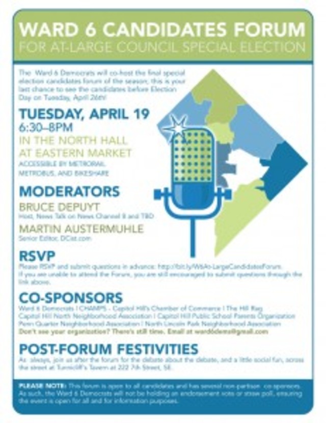 Martin, along with TBD’s Bruce DePuyt, will moderate a candidate forum inside the North Hall at Eastern Market this evening. The forum, which is co-sponsored by several Capitol Hill neighborhood groups and the Ward 6 Democrats, begins at 6:30 p.m. and is open to all candidates. Attendees are encouraged to RSVP and submit questions in advance.
