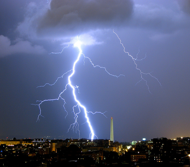 Yesterday was the kind of “springtime” Sunday we’re far too familiar with here in the District — muggy and somewhat uncomfortably warm during the day, a big storm come evening. And when that big storm arrived, it really arrived. Areas south of the District were pelted with sheets of rain, but the real show was the lightning bolts that lit up the night sky for hours. A few of our more intrepid photography contributors took their chances on various rooftops to try and capture the storm in all its glory.