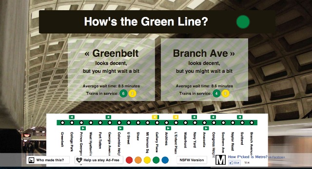 The profanity of its NSFW version aside, we’re quite enamored with this Metro monitoring site that began making the rounds around the Internet this morning. Each line has its own slick real-time monitoring page which provides key information (like where each train is on the line and average wait times) and doles out common sense advice (“looks decent, but you might wait a bit”) for each direction. Very handy, indeed.