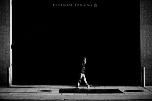 DPinDC takes advantage of the high contrast light in downtown D.C. as he photographs a man walking past the dark entrance of a parking garage. (EXIF.)