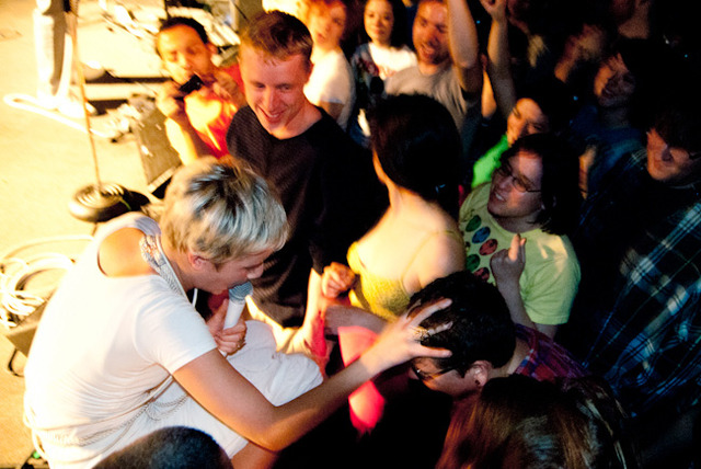 Additionally, YACHT proved that if they wanted us to dance, that they would do that as well. Although YACHT had, for six years, been the solo project of Jona Bechtolt and definitely is deeply rooted electro-pop (a subgenre that can make for a static live performance), singer Claire L. Evans had the Black Cat under her thumb from song one. Proclaiming herself a god and the audience as her children, she alternately writhed on the stage floor and laid her hands on the foreheads of the audience, as if it were possible to cure what ailed humanity with tinny cowbell beats, swooning androgynous vocals and synth-constructed hooks. This was her room and she lorded over it.