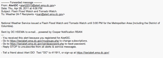 Now, we’ve given the city’s AlertDC system some grief in the past. But today’s latest transgression — emailing everyone subscribed to the service shortly after 4 p.m. to let them know that the District is under a tornado watch until 3 p.m. — just simply can not go without shaming.