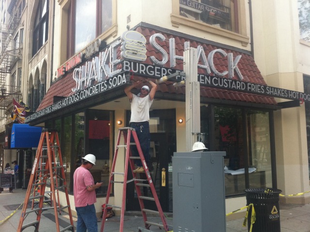Photo by Mehan Jayasuriya.DCist contributor Mehan Jayasuriya reports: “Breaking burger-related news — the sign at the Dupont Shake Shack is being hoisted up, as we speak.” In the immortal words of Morrissey, “I am human and I need to eat roadside burgers, just like anyone does.” (Or something like that.)