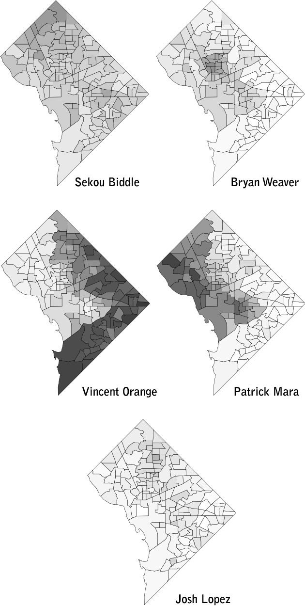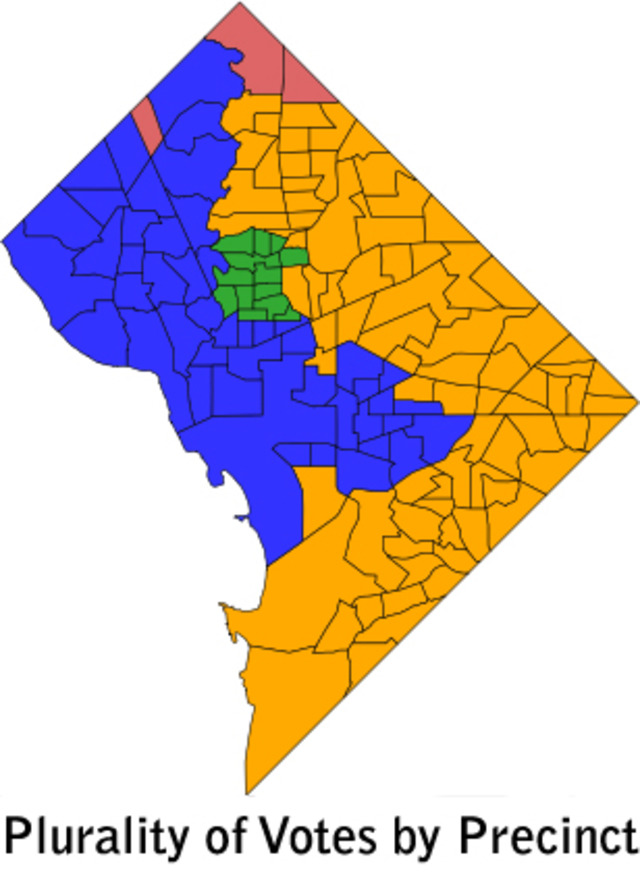 In last week’s contest, victor Vincent Orange won Wards 4, 5, 7 and 8, which are primarily African American. Runner-up Patrick Mara took wards 2, 3 and 6, which — while certainly not devoid of diversity — are mostly white. Bryan Weaver claimed Ward 1 — the city’s most diverse — while Sekou Biddle and Josh Lopez showed the most crossover appeal, doing well across the city but not particularly well in any one part of it.