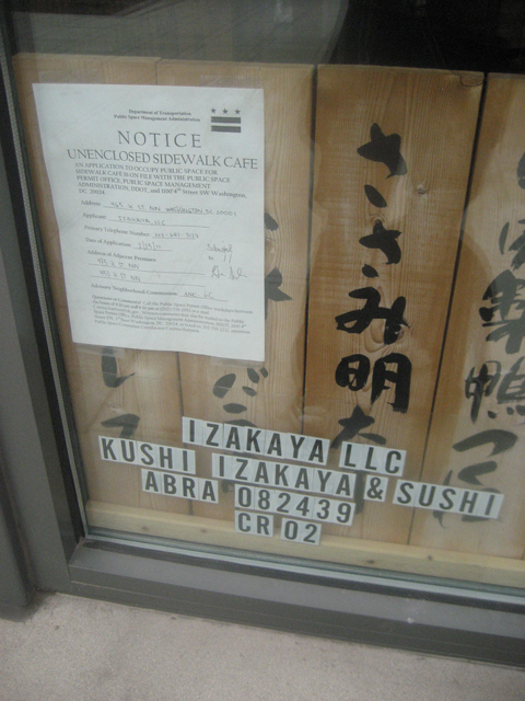With today’s cold, dreary weather, a sidewalk cafe is likely the furthest thing from most people’s minds. But when we walked by Kushi Izakaya & Sushi last week, we noticed that they had applied for a permit for an unenclosed sidewalk cafe in front of their location on 465 K Street NW.