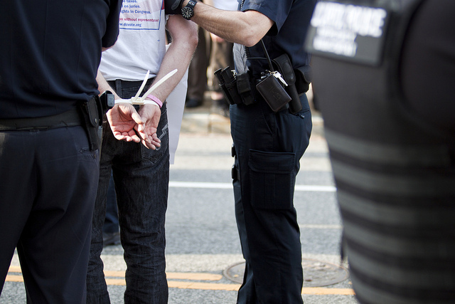 Photo by thisisbossi.Fifteen of the 41 people that were arrested during an April 11 protest for D.C. autonomy on Capitol Hill will appear in court tomorrow, where they’ll enter pleas for misdemeanor charges of “Unlawful Assembly – Blocking Passage.” (The remaining protesters, including Mayor Vince Gray, opted to pay $50 that day and not appear in court.) Three other activists arrested during a related protest only days later will also appear.