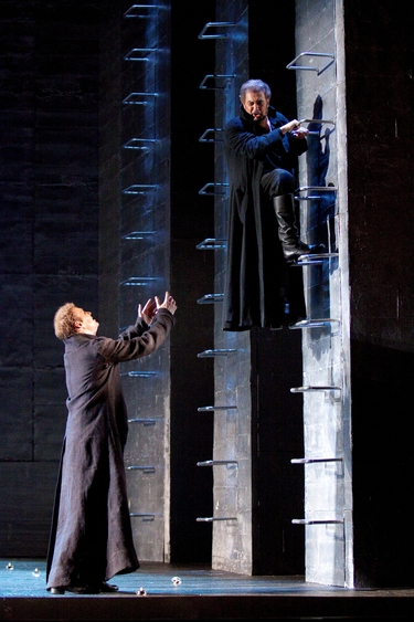 Shawn Mathey (left) and Plácido Domingo (right) in Iphigénie en Tauride, Washington National Opera, 2011 (photo by Scott Suchman)Matching her in every way except full-bodied strength is the swan song of the company’s departing artistic director, Plácido Domingo, who moved around the stage with dignity, energy and flexibility that belied the fact that he just turned 70. Even more surprising is that this remarkable singer continues to explore new roles, often moving downward into the baritone range (or transposing tenor roles downward) as his higher range becomes less reliable. Oreste was originally written for a high baritone, even partially notated in C clef, and then sung by a tenor in the Vienna revision, so it sits comfortably for Domingo’s current vocal disposition: his sound blossomed particularly well in the second half. He has recently brought this remarkable opera to the Metropolitan Opera in New York, and it is in many ways his parting gift to the Washington audience.