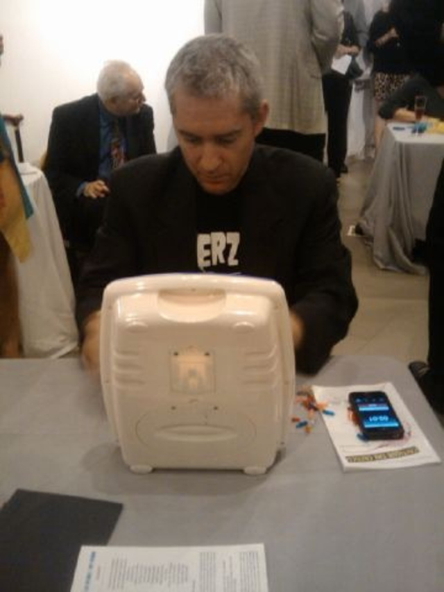 AAC invited a number of local critics, politicians and media personalities to compete: ABC7’s Maureen Bunyan, DC Magazine Publisher Peter Abrahams, the Newseum’s Sonya Gavankar McKay, Delegate Patrick Hope from the Virginia House of Delegates, Justin Young from ReadySetDC, Food Network personality Mary Beth Albright, David Foster from the Virginia Board of Education, Peter Winant from WETA’s Around Town, and DCist’s own Ian Buckwalter and Kelly Rand. Eight of those ten participants were placed into a tournament bracket, going head-to-head in creating works of art. The other two (Rand and Winant) were on the “bench,” to be called upon if any of the contestants wanted to call in a substitute in any of the rounds of competition. The audience was to judge the works and determine a winner, who would then move on to the next round of competition. The gimmick: the artistic mediums were childhood implements — Etch A Sketch, Pipe Cleaners, Lite-Brite, Play-Doh, Legos, Tinker Toys and finger paint. Contestants had only five minutes to create, after which they had to explain their piece to the crowd; emcee Philippa Hughes of the Pink Line Project would then determine the winner based on the volume of applause.