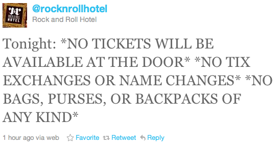 Such stories, obviously, are not lost on the management at the Hotel, which posted a somewhat out-of-character, all caps warning on its Twitter page this morning (see above) letting people know that attendees should bring themselves — and little else — to tonight’s show. But even if everyone is on their best behavior, we’d recommend not filling up on a big dinner on H Street tonight: one imagines that personal space will be at a real premium inside the venue tonight.