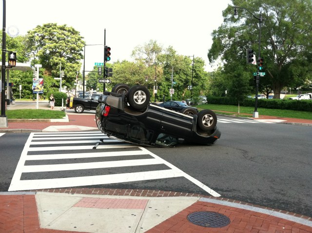 This incredible image of an overturned vehicle comes to us courtesy reader Matt Singerman, who snapped it at the intersection of 22nd and P Streets NW around 8:15 a.m. this morning. According to D.C. Fire and EMS, emergency crews were evaluating only “minor” injuries, which is incredible considering that the vehicle is completely turned on its roof. No word yet on what caused the vehicle to flip so dramatically, but it was cleared from the scene by 9:50 a.m.