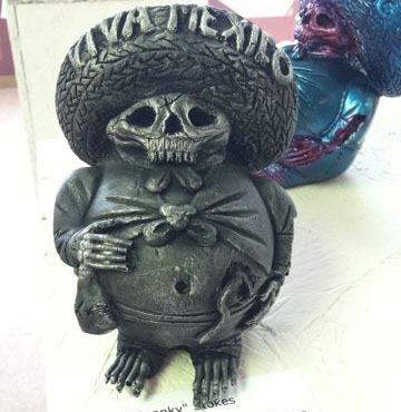 Commerce and art meet uneasily in a second-floor gallery of D.I.Y. Vinyl, variations on collectible toys like the kidrobot Munny. The room’s walls are painted with utility lines, railroad cars and other urban signifiers, ironic in that the space sits on an increasingly gentrified stretch of 14th Street NW, mostly shorn of the grit that these walls romanticize. (Anybody remember Soul Parking across the street?) Among these ambitiously customized toys is an intriguing anomaly that stands out from the grotesque Munnies. John “Spanky” Stokes’ series of “Borracho de Los Muertos” resins slyly riffs on Day of the Dead imagery. His skeletal “drunks” seem bloated on mass consumption — not just of corn squeezins but of entire colonies of miniature collectibles. The Viva Mexico sombreros add a scathing critique of cultural tourism.
