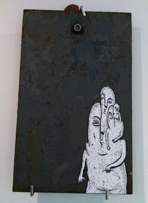 Ben Tolman‘s wheat paste grotesques are well within the street art tradition that predominates here. But he also breaks away from tradition by effectively closing the fourth wall. His blobular ink drawings are pasted on rusty metal plate canvasses that approximate the texture of weathered utility poles. These are more compelling backdrops than the “native habitat” where I recently caught one of his wheatpastes: the shiny backside of a Foggy Bottom stop sign. The framing of these mini-canvases isolates the figures, and encourages the artist’s keen compositional sense: with plenty of negative space, Tolman’s droopy-eyed beasts emerge from the frame’s edges like fun-house mirror Gyllenhaals.