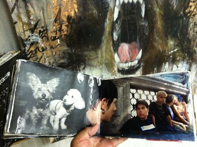 One of James Walker’s art books.James Walker‘s skate decks are also weathered, but his assemblages are but a slice of what’s in store in the full gallery of his works: paintings, shadowboxes and photographs, culminating in a fascinating series of artists books and scrapbooks, fragile and densely textured with photographs, sketches, painting, personal ephemera, and in one book, a carefully scotch-taped cockroach. The natural state of things is decay, Walker suggests. A recurring, snarling dog seems like an anti-social avatar at first. But the animal’s appearance in the artist books, and in a diptych in the Sullivan room, reveal it to be an homage to the courage of a faithful companion, an unexpectedly touching connection with nature in the middle of a sprawling urban artscape.