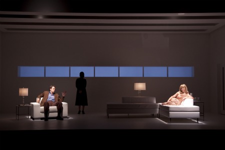 Steven Culp as Deeley and Tracy Lynn Middendorf as Kate with Holly Twyford as Anna (background) in the Shakespeare Theatre Company’s production of ‘Old Times’ by Harold Pinter, directed by Michael Kahn. Photo by Scott Suchman.Watching the Shakepeare Theatre’s new production of Harold Pinter’s Old Times is a little like watching a life-size shoebox diorama. Designer Walt Spangler’s set, lit with a cinematic eye by Scott Zielinski, turns the stage of the Lansburgh Theatre into a rigidly-defined rectangle, with white walls, ceiling and floor, white modernist furnishings and a long row of rectangular windows at the back meant to look at the sea beyond the walls of this remote English country house. It’s cold, sterile and more enclosed than one is used to seeing at the theater, and heightens the voyeuristic sense of peering in on a carefully constructed moment in the lives of its characters.