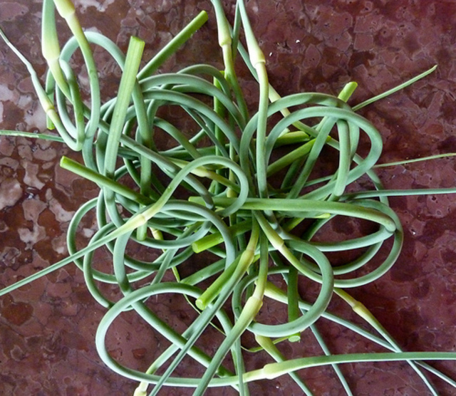 Photo by bgblogging.I was first introduced to the garlic scape by former Washington Post food writer Kim O’Donnel back in 2006. These beauties, resembling scallions or young onions, are a cousin of these veggies, but unique and interesting on its own. Curlycued, verdant green, and pleasantly pungent – they are in season at the farmers market now.