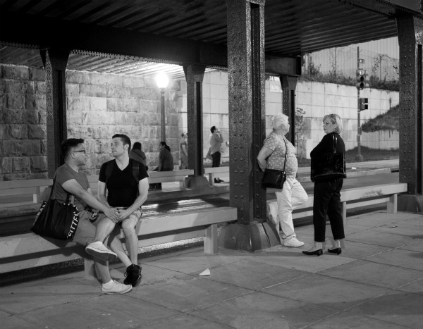 This lovely photo by Kevin H. has a wonderful texture and depth of field. The waiting couples in the front seem staged, as in a play, while the people milling about in the back draw your eyes in and keep them moving about the composition. (EXIF.)