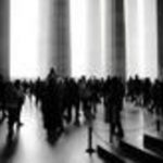This lovely photo by Kevin H. has a wonderful texture and depth of field. The waiting couples in the front seem staged, as in a play, while the people milling about in the back draw your eyes in and keep them moving about the composition. (EXIF.)