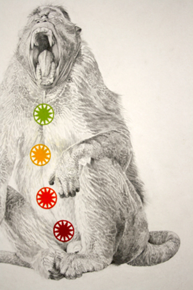 >> Do you compost? Are you a good person? Haven’t you always wanted a monkey? Okay, I threw that last one in there, but you know you answered yes. Test your purity and monkey-interest level in the slot-machine-like interactive sculpture The New American Spiritual Tent, part of Jenny Sidhu’s American Temple, opening at Flashpoint Gallery on Saturday. With the purity test, Mullins explores the idea of spirituality as a product, describing the irony of the reaction against consumer culture manifested in more consumerism. In her series Spiritual Accessories, portraits of monkeys with human qualities, Mullins combines minute graphite renderings with candy-colored chakras to demonstrate the complex role of spirituality in America. The exhibition opens with a reception on Saturday from 5 to 7 p.m. On July 20, Flashpoint Gallery will partner with The Pink Line Project to present a Pink Panel @ Flashpoint with the artist. Free.