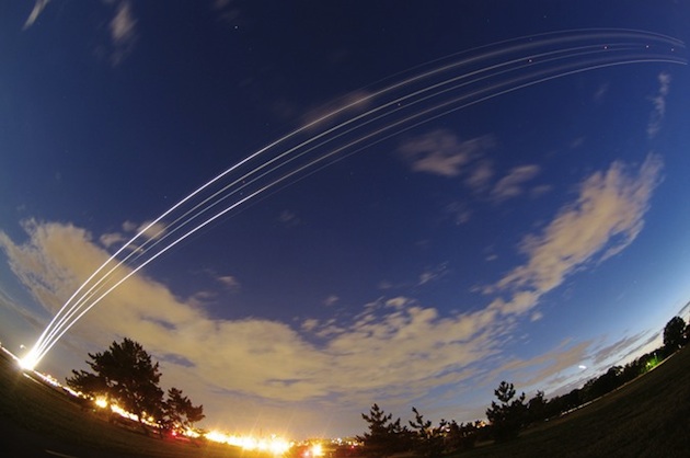 Like many of you, I love everything about Gravelly Point, especially when punctuated by the roar of a couple of jet engines overhead. Philliefan99 went down there last night and snapped this cool looking long exposure fisheye of a plane taking off from National Airport. (EXIF.)