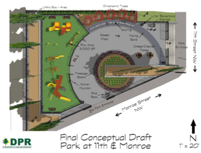 DPR’s redesign of the park — which has long had a reputation around the neighborhood as a hangout for less-than-savory characters and was closed for a period last year due to lead contamination — aims to make the space a little bit more friendly with a playground, some ornamental trees and a more open plan. (The design is very similar to the back on Upshur Street.) But, as with most discussions revolving around the use of public space, not everyone is thrilled with the plan — for example, this poster on the Columbia Heights listserv causticly bemoaned the park’s lack of shade.