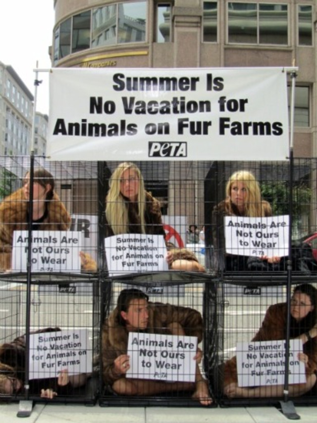 Five literally hot ladies and one dude took to the streets in front of the downtown Macy’s department store this afternoon to protest fur farms. On the complete other end of the spectrum from an “I’d rather go naked than wear fur” demonstration, the six were draped in fur to make the point that furry animals suffer during the summer months when confined in cages in their natural coats, as well as during their deaths. The protest was staged by PETA, People for the Ethical Treatment of Animals.