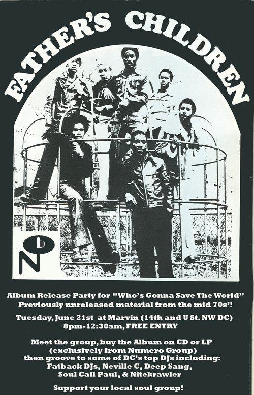 >> The 1970s were filled with soul bands that are largely forgotten today. Fortunately, good music tends to have a long shelf life. D.C.’s own Father’s Children have piqued crate diggers’ interest in recent years with the track “Hollywood Dreaming” — to the point that a previously unreleased album from 1973, Who’s Gonna Save the World?, is finally going to see the light of day after its master tapes were saved from certain doom. The guys will be on hand at Marvin with sound selectors the Fatback DJs, Nitekrawler, Neville C, Deep Sang and Soul Call Paul. Free. 8 p.m.