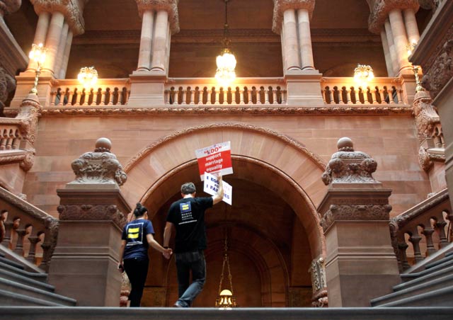 Gay marriage supporters at the New York state Capitol (AP).- Gothamist was jubilant that after a long fight, gay marriage was finally passed by the NY State Legislature.