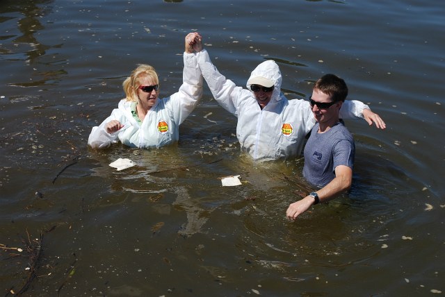 That’s what a group of environmental activists, scientists and lawmakers did yesterday afternoon, hopping into the Anacostia in Bladensburg, Maryland in order to “raise awareness about the failures to meet the July 1, 1983 deadline set by the landmark Clean Water Act for waterways to be made swimmable and fishable.” The event also featured speakers like Maryland State Senator Paul Pinsky (D-Prince George’s County) and former U.S. Senator Joe Tydings calling on D.C. and Prince George’s County lawmakers to expand and tighten Clean Water Act permits and strengthen development control measures.