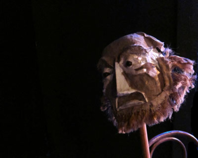 The mask of Captain Ahab, designed and built by Amy G. Bergman and Marianne Murphy. Photo by Pat Padua.The Loose Ends Theatre Collective’s Moby Dick, An Adaptation for Theatre, efficiently condenses Herman Melville’s 200,000-plus words into ninety minutes of compelling theatre. Michael Bergman adapted the classic text for eight actors who take on a multitude of voices and puppet masks, save for the singular Ishmael. The masks — sometimes raised on poles, sometimes hand-held — are constructed for vivid characters like the landlord of the Spouter Inn, Father Mapple, who delivers the powerful Jonah sermon, and, most prominently and symbolically, Captain Ahab, whose ragged visage is held high above actors’ heads in a simple but effective display of authority.