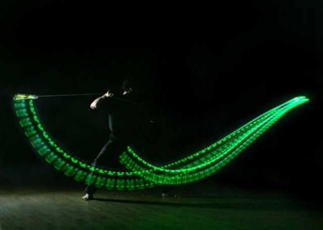 Much of the time, the theater is in complete darkness. The striking visual element came from the lighting attached to each of the fighters’ hands, feet and weapons. Whether it be a fist or a set of nunchucks, the movements create waves of light, similar to what one might see at a rave. The tool that benefited most from this treatment was the rope dart, an intimidating weapon that became a playful instrument of grace. More than one cast member played each character, but the narrative was always clear because every character was assigned a specific color. A soundtrack comprised of live hand drums and recorded Eastern and electronic music accompanied the on-stage action. For some sequences, strobe and dim lighting was used to create an effective contrast with the majority of scenes where artists faces were hidden. After all, a man breaking four cinder blocks with his fist would be far less impressive if no one could see it.