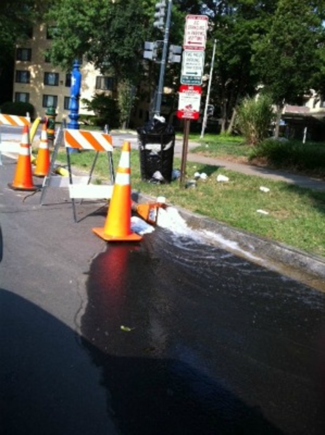 Good question! According to D.C. Water, the water is actually being drained on purpose. “We’re draining a 36″ main through that hydrant so we can fix a valve,” explains D.C. Water spokesperson Alan Heymann. “We can’t fix valves when the mains are pressurized and full of water.”