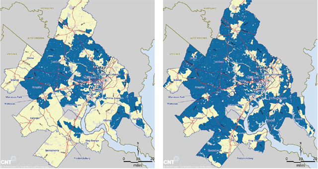 On the left, the areas in yellow indicate affordable housing. On the right, transportation costs are figured into the equation, shrinking the pool of affordable housing.