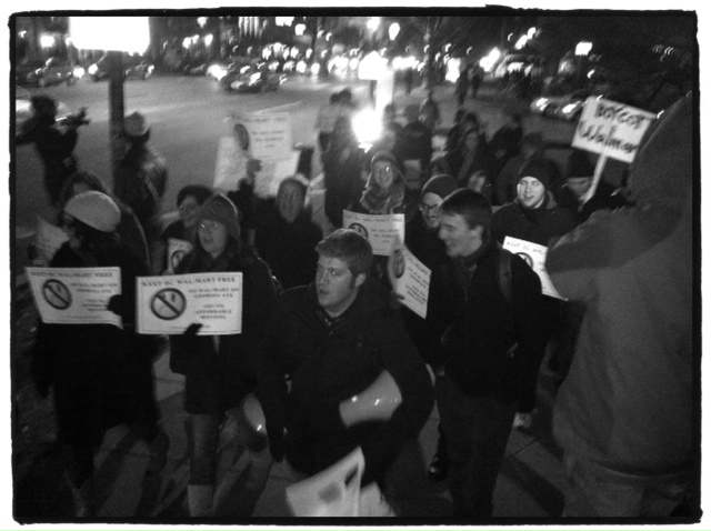 Photo of a anti-Walmart protest in January. (Martin Austermuhle/DCist)A word to the wise for those who might be considering knocking off work a little bit early today and taking a trip to the Kogod Courtyard or to a matinee at Gallery Place: a pro-labor organization has planned a protest of Walmart at the company’s lobbying office on 8th Street NW this afternoon. The organizers of the protest are stating that they expect “hundreds…from around the country” to gather in front of the office building at 701 8th Street NW starting at 4:30 p.m. — the protest is affiliated with the national Jobs for Justice conference which is taking place this weekend in the District.