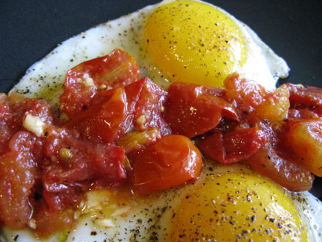 Tomato confit over fried duck eggs. (Alicia Mazzara)Dish of the Week: Anything confit