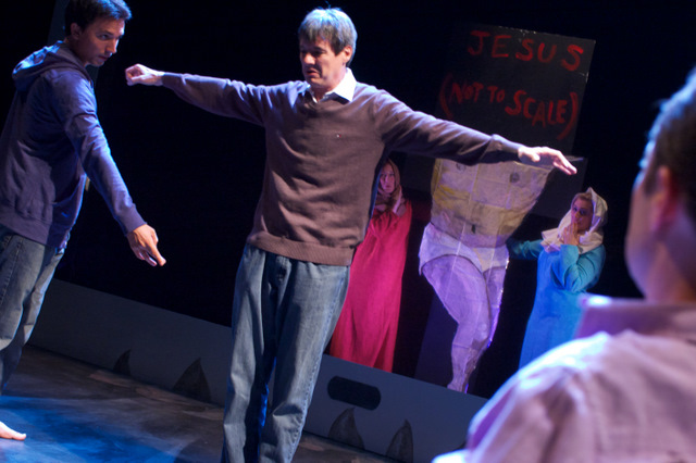 A study of the Devil’s incomprehensibility, Something Past was written and directed by Kathleen Ackerley, Longacre Lea’s own Artistic Director. The Documentarian (Christopher Henley) comes across the Devil in physical form, and the two agree to make a documentary. During the project, the Devil (Alexander Strain) provides surreal home movies of his supposed parents, of his prom date, even of the director and P.A. he hired to direct the Crucifixion. Things appear to be going well, with the Narrator (Daniel Vito Siefring) becoming reality-show-watching buddies with the infernal one, until the “infernal” part comes to the fore. When the faith-filled Cameraman (Jason Lott) goes looking for a missing team member, Strain’s Devil shines as a chaos-bringing madman.