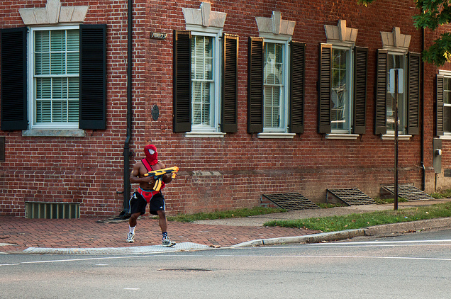 Saturday was the Survive Alexandria 2011 zombie tag event in Old Town, Alexandria. ep_jhu snapped a husky spidey as he conspicuously defended a corner from the undead (and no doubt confused the uninformed living).