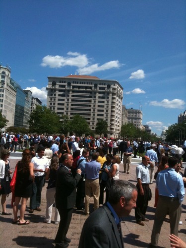Freedom Plaza after the earthquake. (Andrew Wiseman)UPDATE (2:35 p.m.) We’re getting word that service at National Airport has been disrupted, and Terminal A is being evacuated. Students at D.C. Public Schools are all safe, so that’s a piece of good news. We also thought we’d pass along this guide on what to do in case there are any aftershocks.