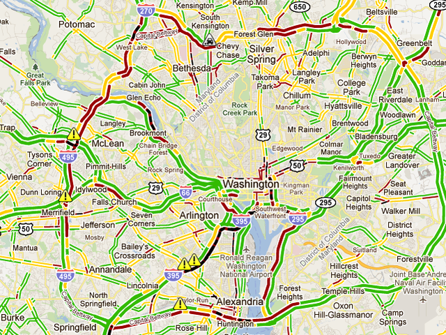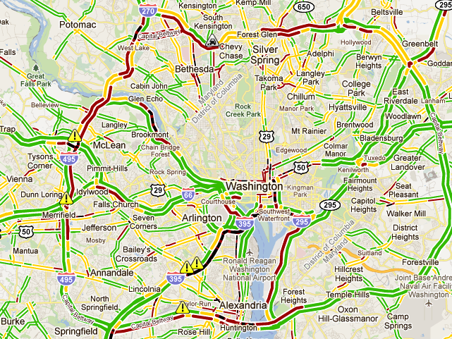 After all today’s hubbub, traffic around the D.C. region is pretty bad. (Solid black lines like that one on I-395 are never good.)