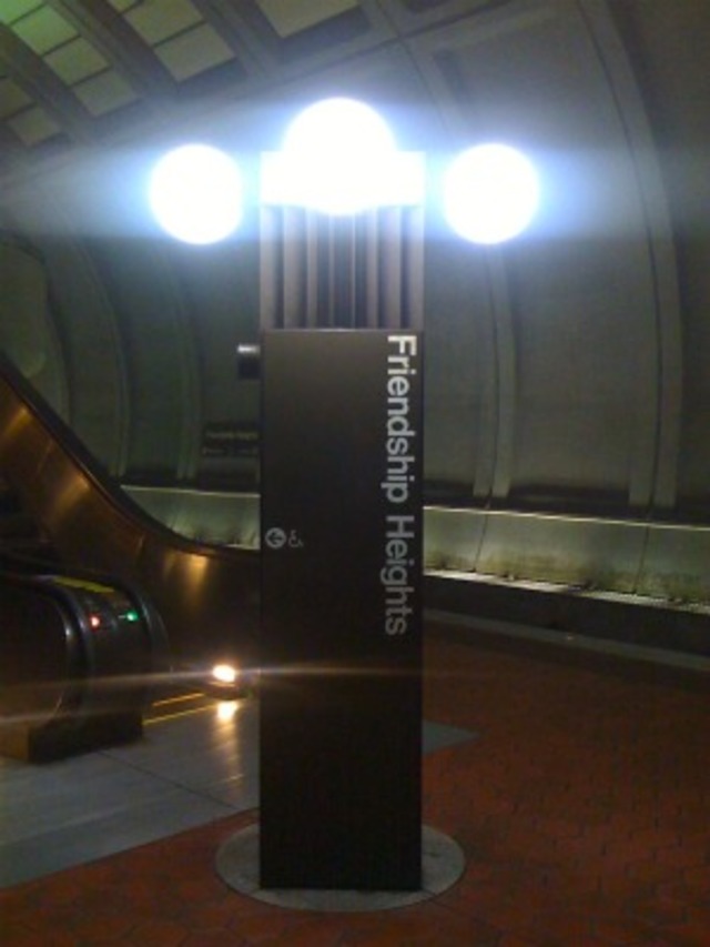 One DCist reader couldn’t help but notice something new on his commute through the Friendship Heights Metro station this morning — this incredibly bright light fixture. The reader, who didn’t want to be named in this post, called the new lights “far too bright” for a Metro station, which has always had a trademark of being indirectly lit.