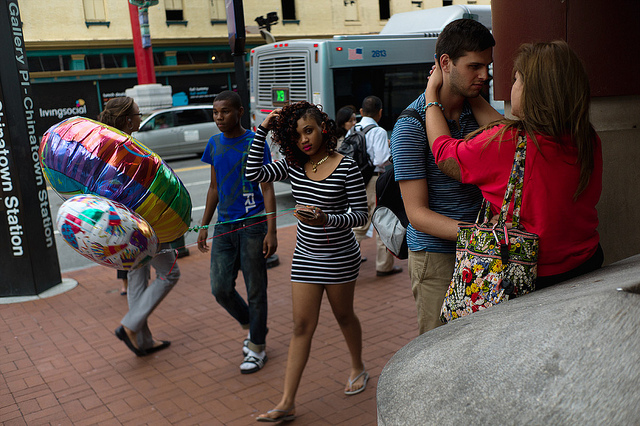 The narrative of this street scene is all held together by stripes: from the bus to the balloon-wielding walker to the scruffy tete-a-tete — and finally, that balloon string, telling us to move along. Matt.Dunn saw it happen.