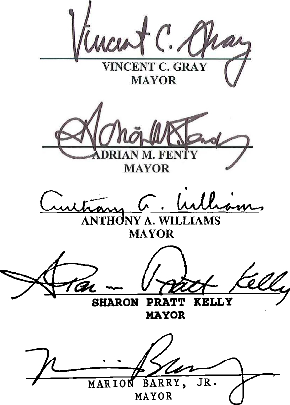 Regardless, in months of randomly scouring through mayoral orders, I came to know and recognize the signatures of each of the District’s chief executives, spare Walter Washington’s, whose orders aren’t online. And whether or not you think their signatures say anything about the type of mayor they were — Anthony Williams started as a CFO, and his mark is deliberate and detailed; Adrian Fenty’s seems more rushed, and he governed in a hurry — it’s at least fun to see how each of the District’s leaders since Home Rule signed their name.
