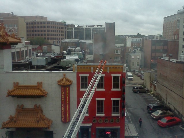 According to an eyewitness, fire trucks have blocked off access to H Street NW between 6th and 7th Streets due to a report of a chimney fire at Ming’s Restaurant. The building, located at 617 H St NW, is being sprayed down from hoses brought to the roof of the neighboring Tony Cheng’s — according to our witness, the smoke was far worse than it was before firefighters arrived on the scene and the above photograph was taken.